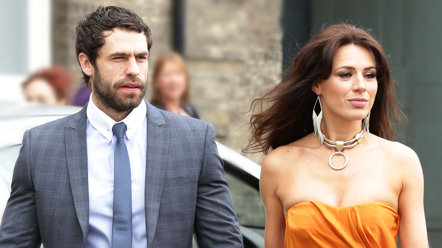 Kelvin Fletcher and Liz Marsland , make their way to St Mary’s Church in Bury St Edmunds, Suffolk, for the wedding of former Coronation Street actress Michelle Keegan to The Only Way Is Essex star Mark Wright.